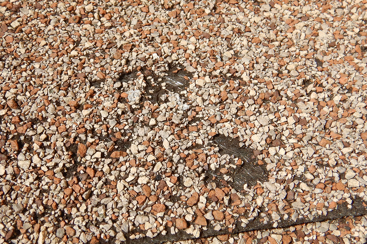 The homeowners filed a claim for hail damage to this roof, but these irregularly shaped areas of granule loss are evidence of human-caused damage.