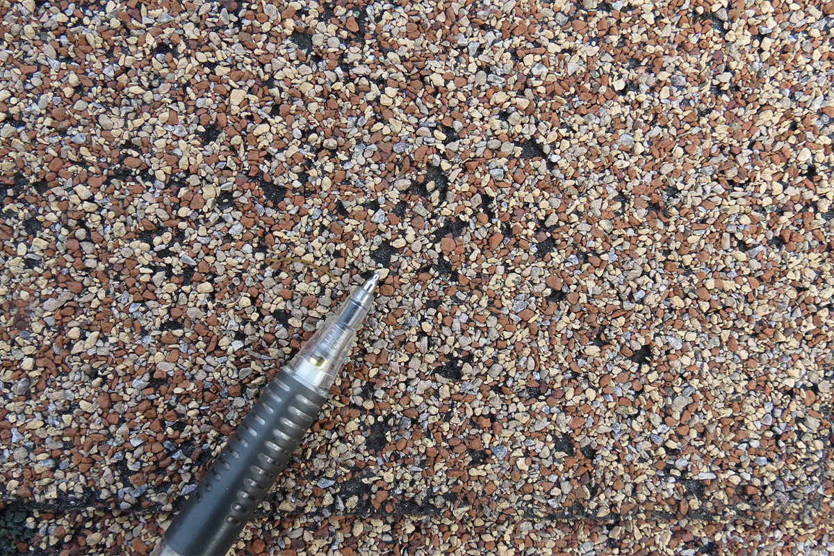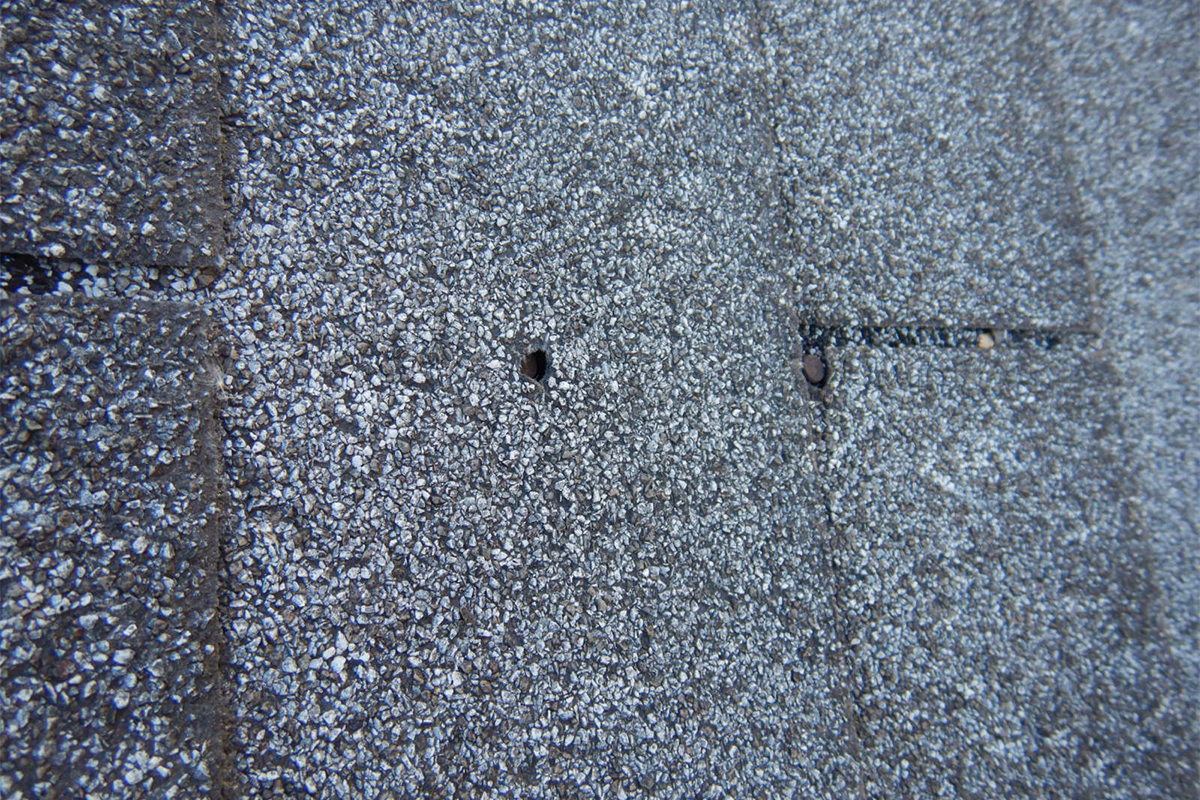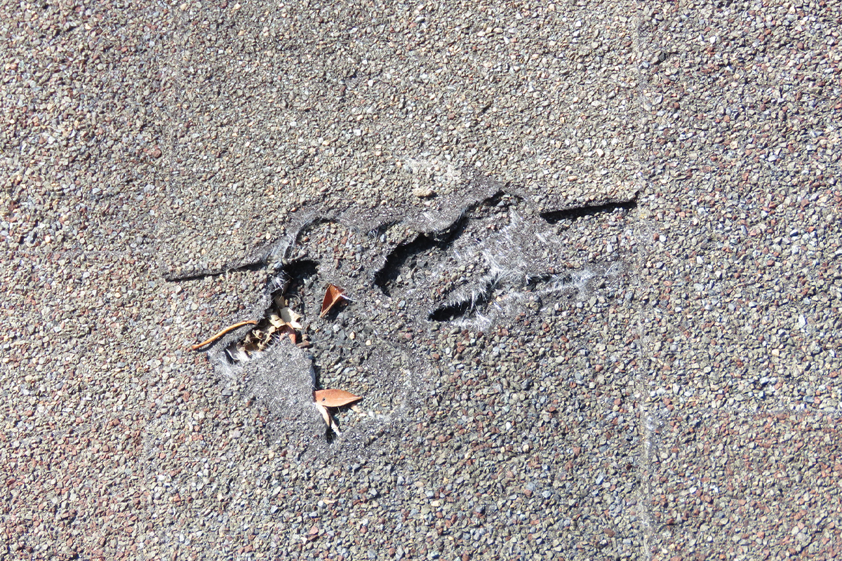This shingle hasn’t been damaged by hail. Instead, it shows animal damage, likely from birds searching for seeds or insects beneath the shingle.