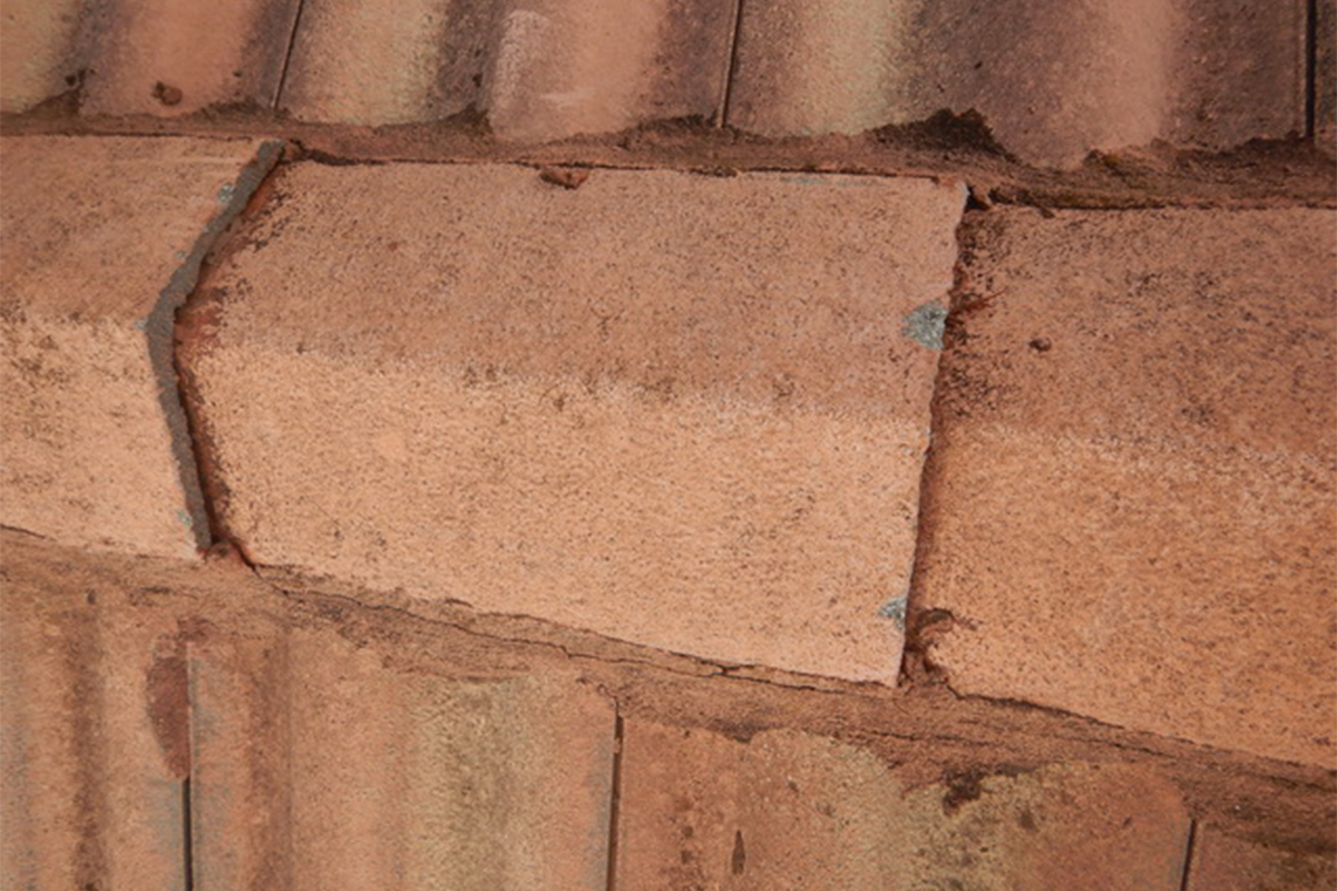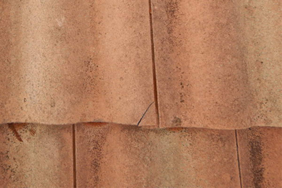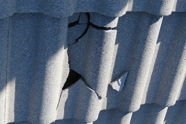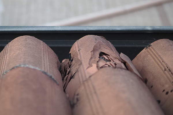 The ping pong ball-sized hail chipped this clay tile. This may allow water to penetrate under the tile, leading to further water-related damages.