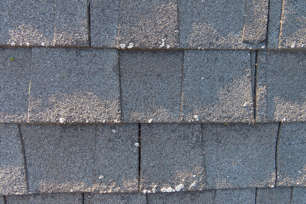 Moss and lichen entwine shingle granules with their roots, taking the granules with them when they’re removed. Moss and lichen growth has caused widespread granule loss to the shingles on this roof.