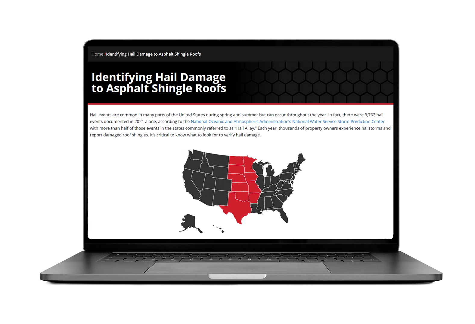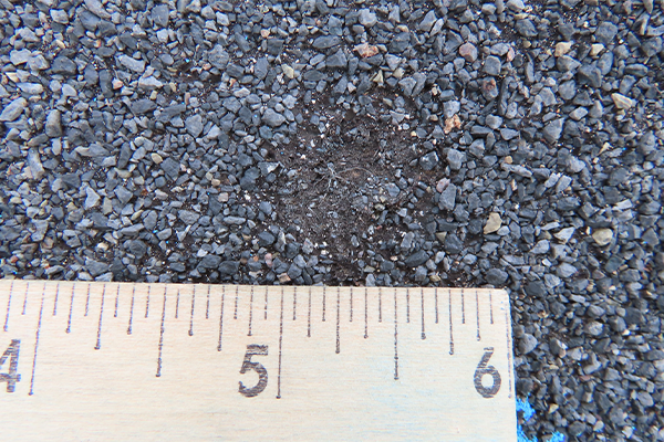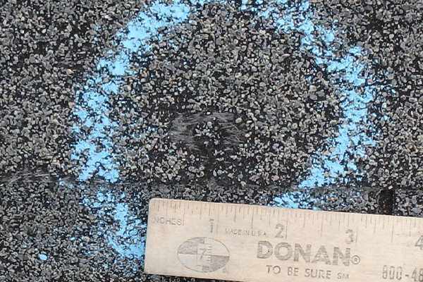 The half dollar-sized hail fractured this dimensional shingle, exposing the asphalt layer below the granulated layer and reducing the life of the shingle.
