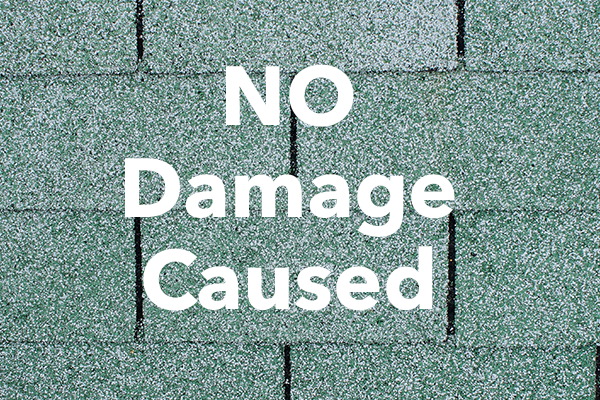 The dime-sized hail did not damage this three-tab asphalt shingle. It’s unlikely to damage dimensional-style shingles, or clay or concrete tiles.